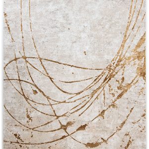 Este tapete de estilo moderno presenta un diseño abstracto en color dorado sobre un fondo neutro. Ideal para añadir un toque artístico y contemporáneo a cualquier espacio. Su diseño versátil se adapta a diversos estilos decorativos.
