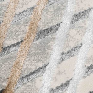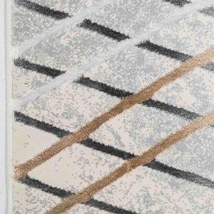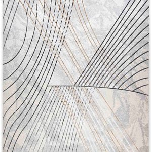 Transforma tu espacio con este tapete de diseño moderno. Sus líneas en gris oscuro y dorado añaden un toque elegante y sofisticado. Ideal para darle un nuevo aire a tu hogar.